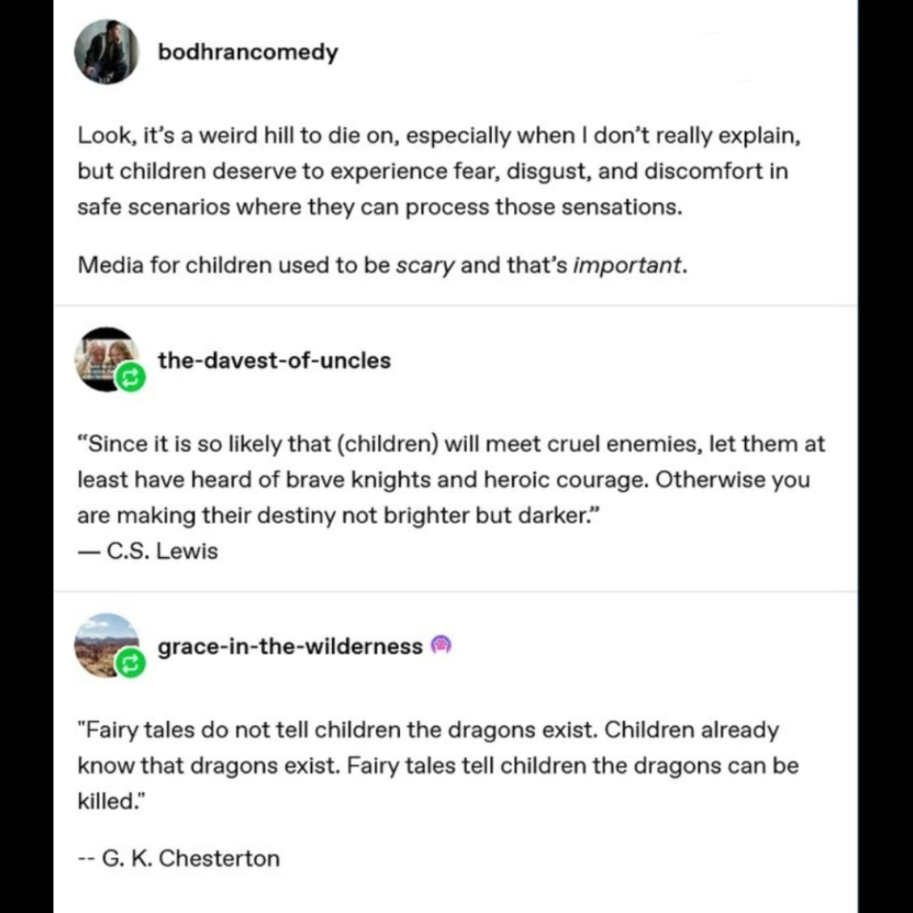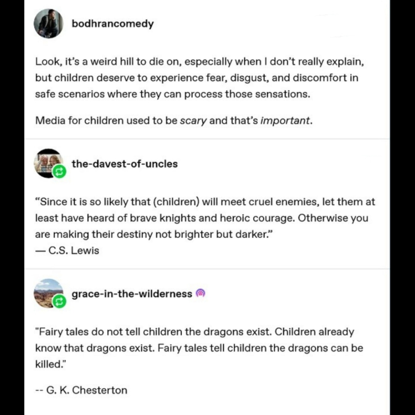 Fairy tales, then, are not responsible for producing in children fear, or any of the shapes of fear; fairy tales do not give the child the idea of the evil or the ugly; that is in the child already, because it is in the world already. Fairy tales do not give the child his first idea of bogey. What fairy tales give the child is his first clear idea of the possible defeat of bogey. The baby has known the dragon intimately ever since he had an imagination. What the fairy tale provides for him is a St. George to kill the dragon. Exactly what the fairy tale does is this: it accustoms him for a series of clear pictures to the idea that these limitless terrors had a limit, that these shapeless enemies have enemies in the knights of God, that there is something in the universe more mystical than darkness, and stronger than strong fear.