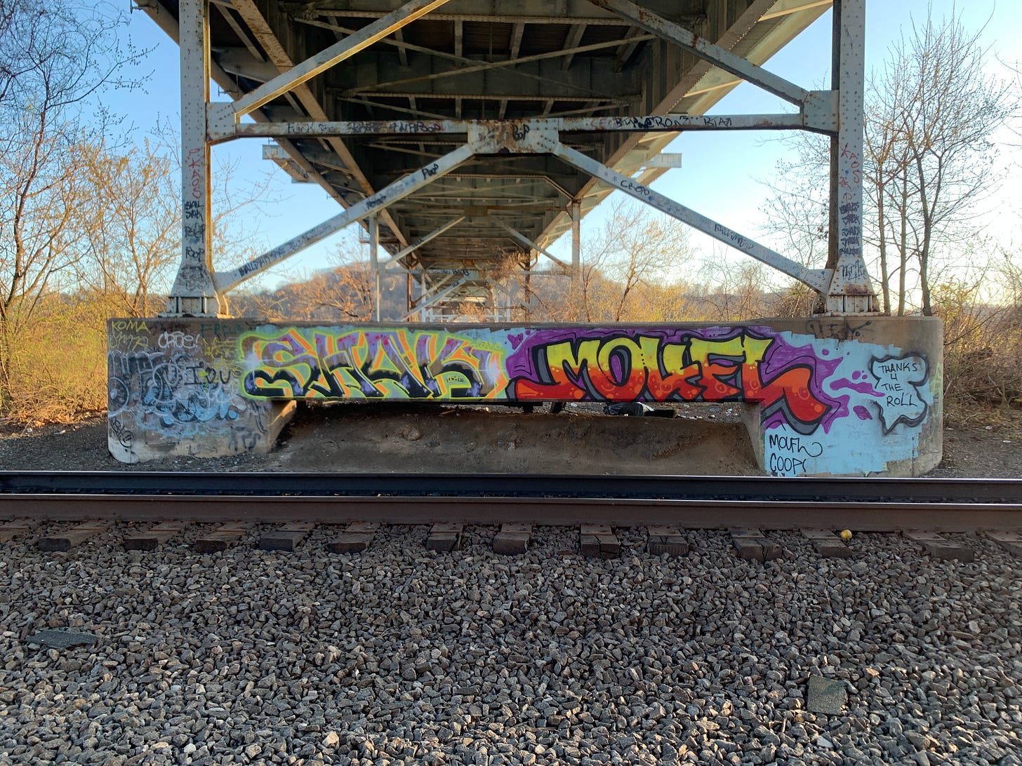 Then there’s my favorite: graffiti. Some people decry it as an eyesore. There’s something about it that inspires me, though. In more than a general way. I’ve got a novel that sprung from graffiti I saw on my walks. It’s going to take quite a bit of editing, though. One of these days, I’ll get it out there.